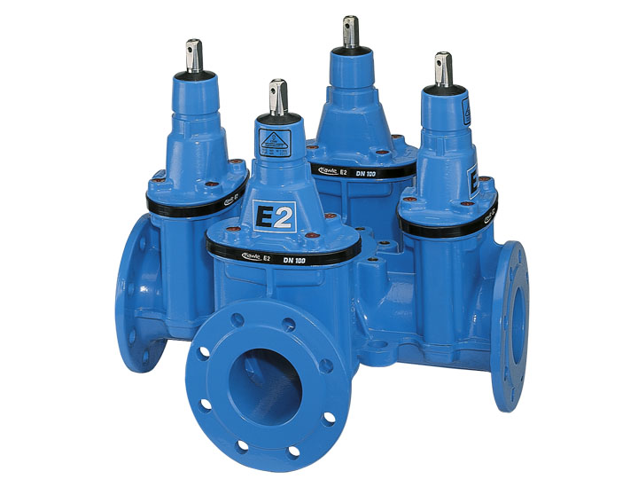 Упруго-запирающаяся клиновая задвижка с гладким каналом имеет разборный корпус из высокопрочного чугуна, покрытие эпоксидной эмалью стойкой к внешним воздействиям, обрезиненный чугунный клин. Благодаря одинаковому диаметру прохода возможна чистка. Крестовина фланцевая с двумя, тремя или четырьмя встроенными клиновыми задвижками Е2. Короткая модель обеспечивает экономию места при монтаже и снижает затраты на материалы. Компактные размеры позволяют уменьшить размер колодца и монтировать его из готовых железобетонных конструкций. Задвижка 4410Е2 крестовина фланцевая выпускается с пожарной подставкой DN 100.